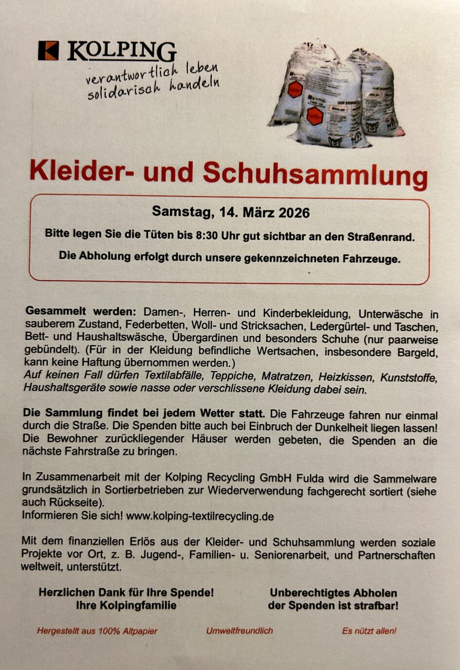 am Samstag, den 14. März 2026 findet wieder unsere große Kleider- und Schuhsammlung statt – und wir freuen uns über jede Spende!
