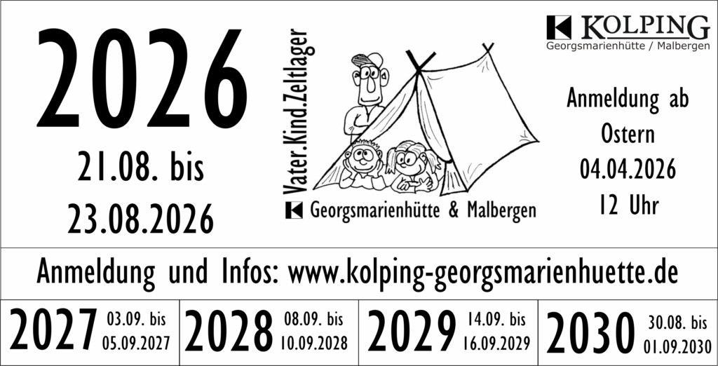 Es gibt neue Termine zu notieren. Und zwar liegen uns nun die Buchungsbestätigungen für das Vater.Kind.Zeltlager bis einschließlich 2030 vor. Besonders freuen wir uns darüber, dass wir den Zeltplatz in Melle-Meesdorf buchen konnten und so an unseren Traditionsort das Lager aufschlagen können.
